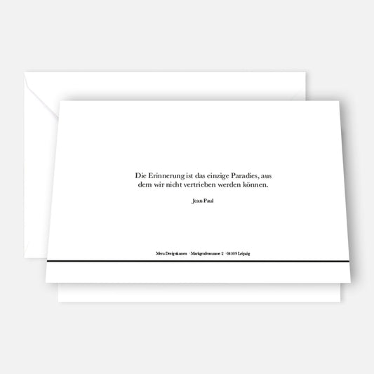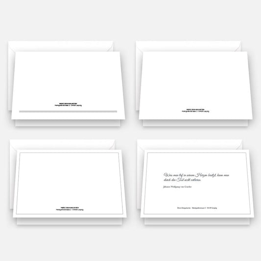 Es gibt keine feste Regel, wann man Trauerkarten Danksagung verschicken sollte, aber in der Regel werden sie einige Wochen nach der Beerdigung versendet, wenn die Angehörigen etwas Ruhe gefunden haben. Dieser Zeitpunkt gibt Ihnen die Möglichkeit, die Anteilnahme in aller Ruhe zu verarbeiten und sich angemessen zu bedanken. Manchmal ist es auch sinnvoll, eine allgemeine Danksagung in einer Tageszeitung oder einem lokalen Blatt zu veröffentlichen, um sich bei einer breiteren Gruppe von Menschen zu bedanken. Eine Trauerkarten Danksagung ist jedoch die persönlichere und intimere Variante, um den Menschen zu danken, die einem besonders nahestanden und die man namentlich kennt. Auch hier gilt: Die Qualität der Karte unterstreicht die Wertschätzung und macht die Geste noch bedeutungsvoller. Für Inspirationen zu Dankeskarten haben wir auch eine eigene Kollektion.