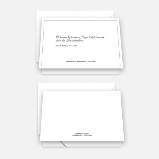 Unsere stilvollen Trauerkarten sind so konzipiert, dass sie eine feierliche und dennoch tröstliche Atmosphäre schaffen. Beliebte Designs umfassen feine, goldene oder silberne Verzierungen, die eine schlichte Karte aufwerten, ohne sie überladen wirken zu lassen. Auch Prägungen, die eine besondere Textur schaffen, können eine elegante Note hinzufügen. Es geht darum, die Karte so zu gestalten, dass sie Trost spendet und die Schönheit des Lebens, das gelebt wurde, hervorhebt.