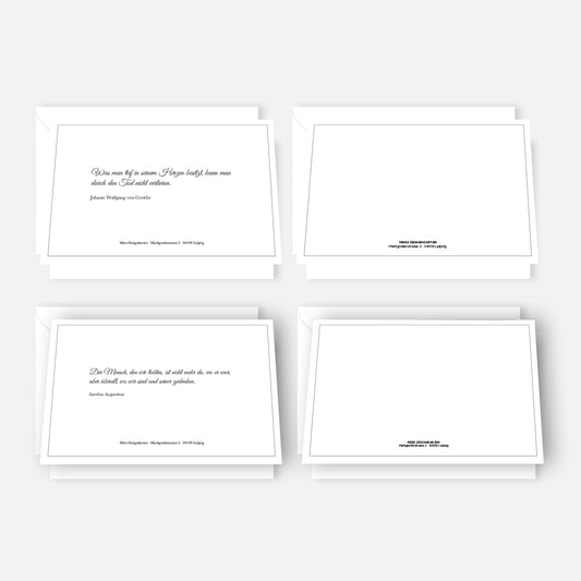 Unsere stilvollen Trauerkarten sind so konzipiert, dass sie eine feierliche und dennoch tröstliche Atmosphäre schaffen. Beliebte Designs umfassen feine, goldene oder silberne Verzierungen, die eine schlichte Karte aufwerten, ohne sie überladen wirken zu lassen. Auch Prägungen, die eine besondere Textur schaffen, können eine elegante Note hinzufügen. Es geht darum, die Karte so zu gestalten, dass sie Trost spendet und die Schönheit des Lebens, das gelebt wurde, hervorhebt.