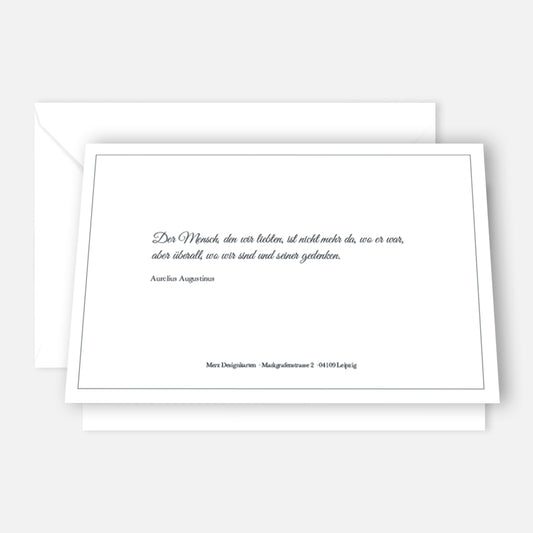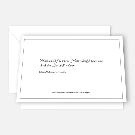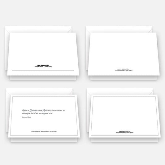 Es gibt keine feste Regel, wann man Trauerkarten Danksagung verschicken sollte, aber in der Regel werden sie einige Wochen nach der Beerdigung versendet, wenn die Angehörigen etwas Ruhe gefunden haben. Dieser Zeitpunkt gibt Ihnen die Möglichkeit, die Anteilnahme in aller Ruhe zu verarbeiten und sich angemessen zu bedanken. Manchmal ist es auch sinnvoll, eine allgemeine Danksagung in einer Tageszeitung oder einem lokalen Blatt zu veröffentlichen, um sich bei einer breiteren Gruppe von Menschen zu bedanken. Eine Trauerkarten Danksagung ist jedoch die persönlichere und intimere Variante, um den Menschen zu danken, die einem besonders nahestanden und die man namentlich kennt. Auch hier gilt: Die Qualität der Karte unterstreicht die Wertschätzung und macht die Geste noch bedeutungsvoller. Für Inspirationen zu Dankeskarten haben wir auch eine eigene Kollektion.